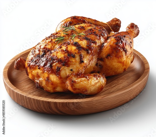 Whole roasted chicken with crispy golden skin served on wooden plate isolated on white background Concept of homemade comfort food