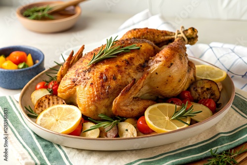 "Whole roasted chicken with golden crispy skin" – A perfectly roasted whole chicken on a serving plate, garnished with lemon wedges, rosemary, and vegetables. The skin is crispy and golden brown.