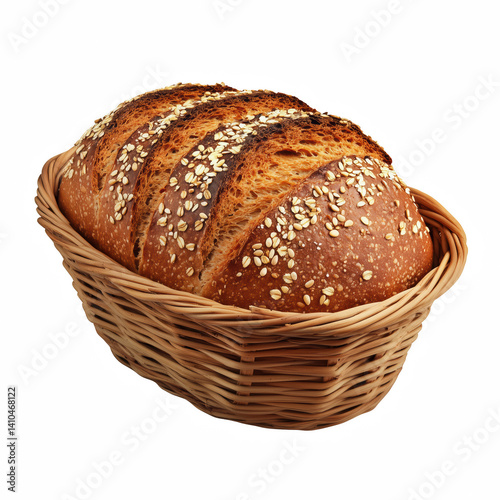 Whole wheat bread loaf with sesame seed topping in wicker basket isolated on transparent background.