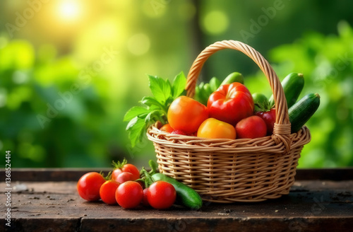 wicker basket filled with fresh vegetables and berries, ripe tomatoes, cucumbers