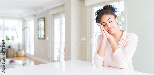 Wide angle of beautiful african american woman with afro hair sleeping tired dreaming and posing with hands together while smiling with closed eyes.