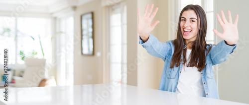 Wide angle picture of beautiful young woman sitting on white table at home showing and pointing up with fingers number ten while smiling confident and happy.