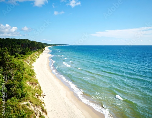 beach, ocean, sky, wave, sand, shore, coast, blue, green, white, sunny, summer, vacation, tranquil, landscape, nature, scenic, beautiful, horizon, coastal, aerial, tree, forest, dune, wide, expansive, calm, water, view, panorama