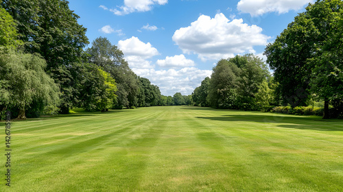 Wide Open Green Grassy Path Through Lush Park