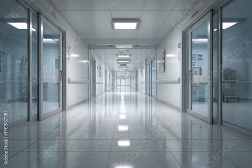 hospital, corridor, hallway, medicals, clinical, health care, door, illustration, depth, roomy, perspective, photorealistic, quiet, realism, reflective, sterile, signage, cleanliness, interior design, equipment, safety, orderly, accessibility, rendering, sanitation, lighting, contemporary, calm, fisheye, digital artwork, glossy