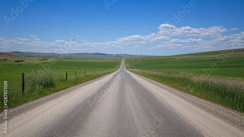 Wide road into distance, flanked by green fields and blue sky. High-definition, horizontal composition. Serene beauty.