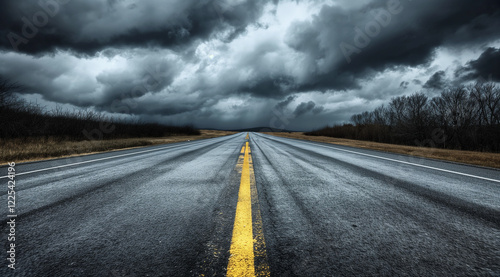Wide Road Stretching into the Horizon Beneath Dark Storm Clouds, Captured with Cinematic Precision and Dramatic IMAX Laser Style