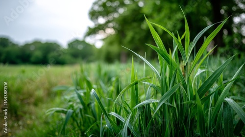 Wide shot of lush dewy meadow grass illuminated by soft morning light with vibrant emerald green blades and gentle bokeh background, conveying freshness and serenity in a spring natural scene with co