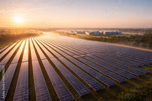 solar, panel, solar panel, photovoltaic, solar farm, renewable, energy, electricity, power, clean, sustainable, transition, green, grid, utility, infrastructure, technology, industry, generation, production, climate, sustainability, carbon, emission, environment, sunrise, dawn, horizon, landscape, field, agriculture, rural, efficiency, innovation, investment, future, sunlight, module, array