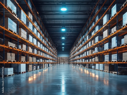 Wide view of an empty warehouse showcasing high shelves filled with boxes and pallets under bright blue lighting
