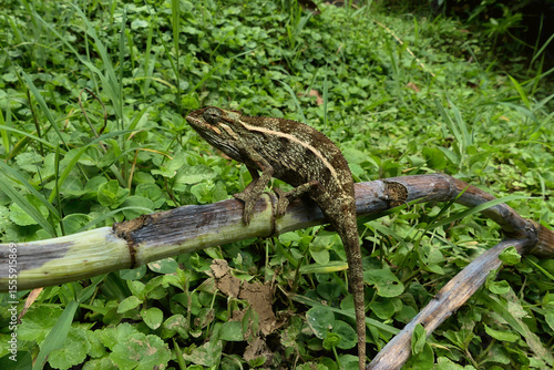 Wild chameleon on a tree. Trioceros ellioti, also known commonly as Elliot's chameleon, Elliot's groove-throated chameleon, and the montane side-striped chameleon. Species indigenous to Africa.