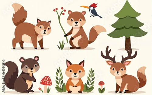 Wild forest animals. Bear, squirrel and deer, beaver and hare, woodpecker and mushrooms, fir tree and birch, berries. Cute baby woodland animal vector set. High quality