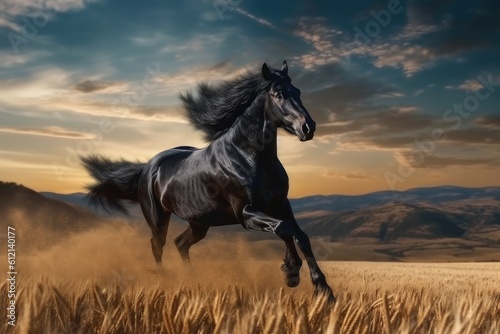 Wild Fresian horse in it's natural habitat - generative ai