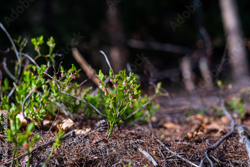 Wild growing baby blueberries. Young blueberries on the branch in the forest.