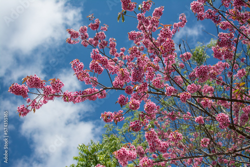 Wild Himalayan Cherry or Sour cherry (Prunus cerasoides) with blue sky, Royal agricultural Research Center (Khun Wang) located in Chiang Mai province.