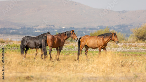 Wild horses roam freely through the sagebrush-covered hills of Nevada, moving together in a tight-knit herd.