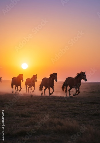 horse, running, sunset, sunrise, field, dusk, dawn, silhouette, equestrian, herd, gallop, wild, nature, animal, freedom, majestic, orange, sky, dust