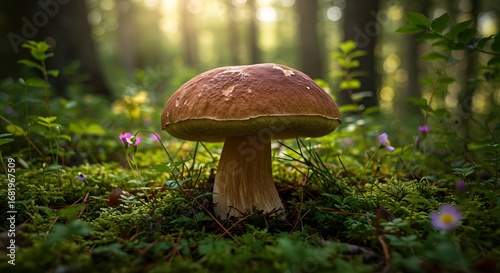 mushroom, fungal, forest, nature, wild, organic, edible, boletus, moss, green, sunlight, light, wood, natural, growth, plant, flora, ecosystem, environment, autumn, fall, harvest, foraging, food, ingredient, healthy, fresh, earthy, rustic, macro, closeup, detail, vibrant, serene, peaceful, tranquil, beautiful, scenic, outdoors, adventure, discovery, timberland, ground, dirtied, stem, cap, gill, habitat
