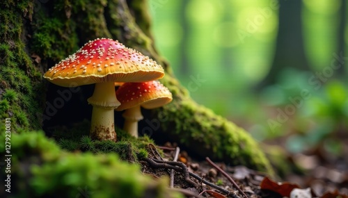Wild mushrooms and tree roots in the forest undergrowth, nature, fungi