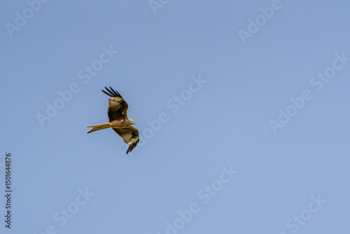 Wild raptor soaring gracefully in the clear blue sky during midday flight over open countryside