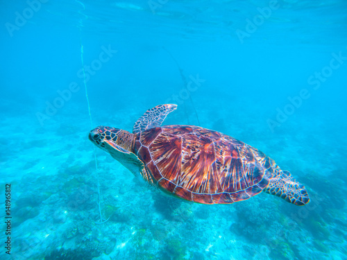 Wild turtle in turquoise blue water. Olive green turtle underwater photo.