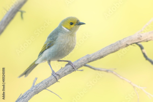 Wild white-plumed honeyeater (Lichenostomus penicillatus) from Australia perched on a branch, Australia
