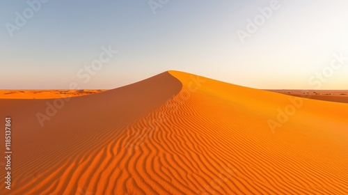 Wilderness and desert pristine, A vast desert landscape features a prominent sand dune bathed in warm sunlight, showcasing the rippled texture of the sand against a clear sky.