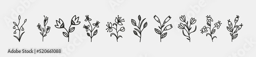 Wildflower line art set. Flower doodle botanical collection. Herbal and meadow plants, grass. Vector illustration isolated on white background. Chamomile, clover, daisy simple hand drawn elements.