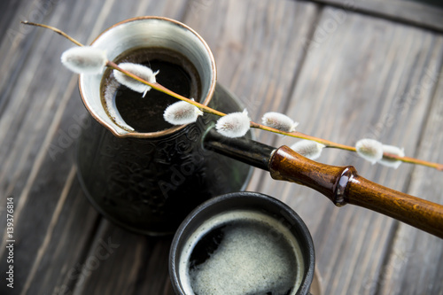 willow twig and coffee. spring symbol. concept in the morning and breakfast