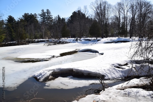 waterfall, waterfall, river, tree, forest, forest, rapid, tepid, rock, boulder, snow, ice, thaw, winter, cold, landscape, water, nature, frost, glacé, sky, tree, white, lake, stream, mountain, blue, season, scene, creek, mountain