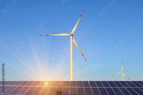Wind power equipment and photovoltaic panels in the sky backgrou