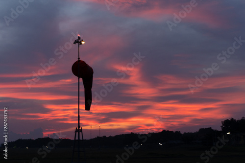 Wind sock under at the dawn under the red orange glowing sky with cirrus and cumulus clouds