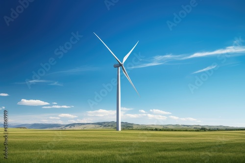 Wind turbine against a background of wide fields and clear blue sky, representing renewable energy