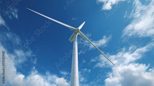 Wind turbine generating clean energy with blue sky and clouds promoting sustainability and renewable power solutions for a greener future