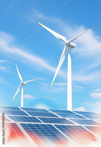 Wind turbines and solar panels closeup on sky background, watercolor, with white tones