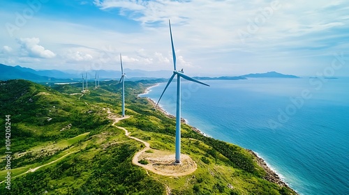 wind, turbine, energy, renewable, power, green, hill, hillside, coast, ocean, sea, blue, sky, cloud, landscape, aerial, view, nature, environment, clean, sustainable, technology, electricity, generation, windmill, windmill, farm, farmland, rural, mountain, mountain, horizon, path, grass, summer, bright, day, beautiful
