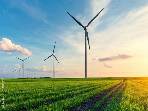 Wind Turbines on a Green Field Under a Bright Sky with Beautiful Clouds at Sunset