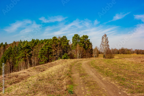 countryside, dirt road, path, nature, landscape, spring, meadow, field, forest, tree, blue skies, bright, rural, ground, terrain, picturesque, scenic, natural, vegetation, wilderness, nobody, travel, journey, way, trail, curve, sunny, clear sky, pine tree, horizon, open space, hillside, dry grass, empty, seasonal change