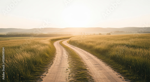 road, field, landscape, sky, nature, journey, path, summer, scenic, sunset, dawn, dirt, rural, gold, horizon, tranquil, environment, view, meadow, light, serene, outdoors, travel, agriculture, grass, dust, sunlight, open, country, terrain, huge, peaceful, growth, ecology, natural, season, wide, empty, direction, earth, trail, winding
