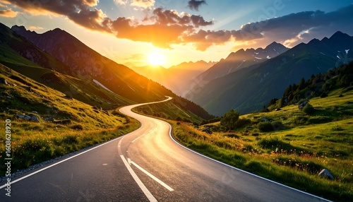 road, mountain, sunset, vale, scenic, nature, travel, vacation, landscape, beautiful, view, highway, driving, adventure, trip, alps, europa, summer, sunshine, cloud, peak, winding, green, picturesque, stunning