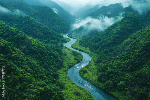 river, winding, vale, mountain, green, lush, forest, jungle, tree, foliage, nature, landscape, scenic, aerial, view, vista, cloud, mist, fog, water, blue, calmness, serene, peaceful, calm, remote, wilderness, untouched, vibrant, colours, beauty, majestic, breathtaking, exotic, tropical, craggy, terrain, geography, ecosystem, environment