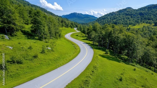 winding road, forest, mountain, greenery, landscape, nature, adventure, travel, scenic, sunny day, picturesque, hill, calmness, exploration, driving, scenic route, vibrant, serene, peaceful, sky, cloud, fresh air, wildlife, journey, curvature, shadow, sunlight, vegetation, summer, terrain, natural beauty, altitude, forestry, highway, unpaved, ecosystem, vista, open road