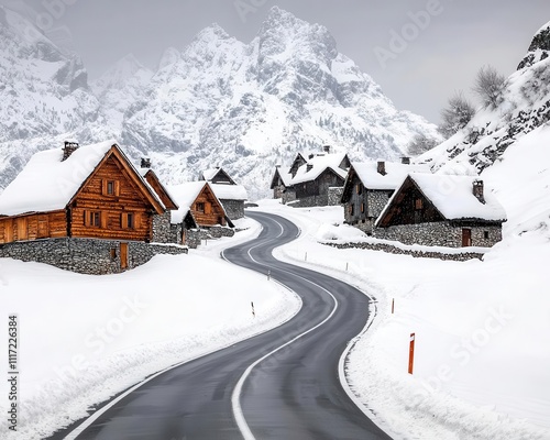 Winding road through a picturesque mountain village, with snowcovered rooftops and distant peaks, Mountain village road, Scenic, peaceful, charming