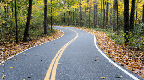 Winding road through vibrant forest adorned with autumn leaves, creating serene atmosphere