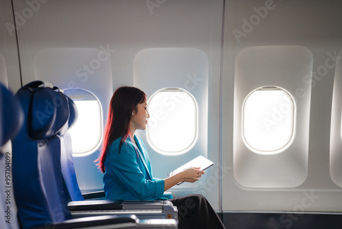 Window Seat Serenity: Young woman enjoys a peaceful moment with her tablet, bathed in the soft light of airplane window.