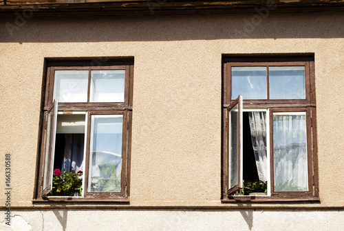 window, house, architecture, building, wall, home, window, glasses, wooden, frame, vintage, wood, brown, white, yellow, brick, red, flower