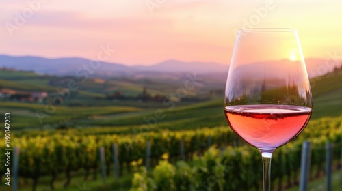 Wine taste event A glass of rosé wine against a scenic vineyard sunset.