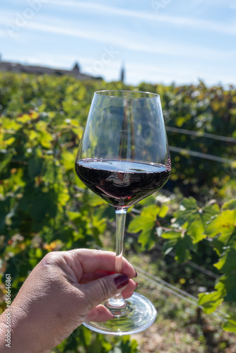 Wine tasting and rows of Merlot red grapes in Saint-Emilion wine making region in Pomerol, right bank in Bordeaux, ripe and ready to harvest Merlot or Cabernet Sauvignon red grapes, France