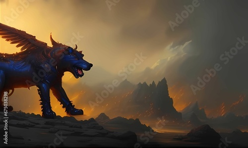 dog, fire, wing, light, silhouette, black, evil, dark, animal, mythical, hell, ai