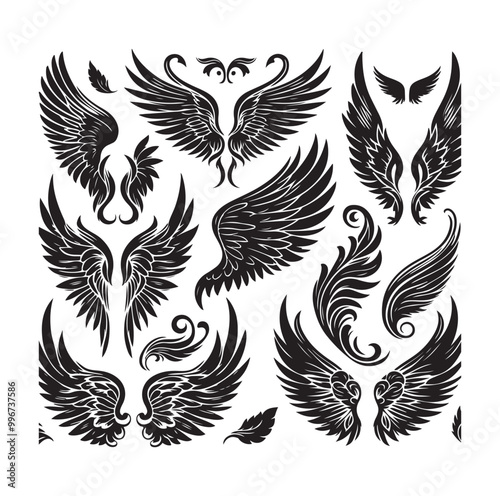 wing, angel, vector, icon, illustration, bird, design, black, silhouette, simple, fairy, set, collection, abstract, isolated, nature, animal, cute, graphic, tattoo, shape, logotype, heaven, element, fly, symbol, emblem